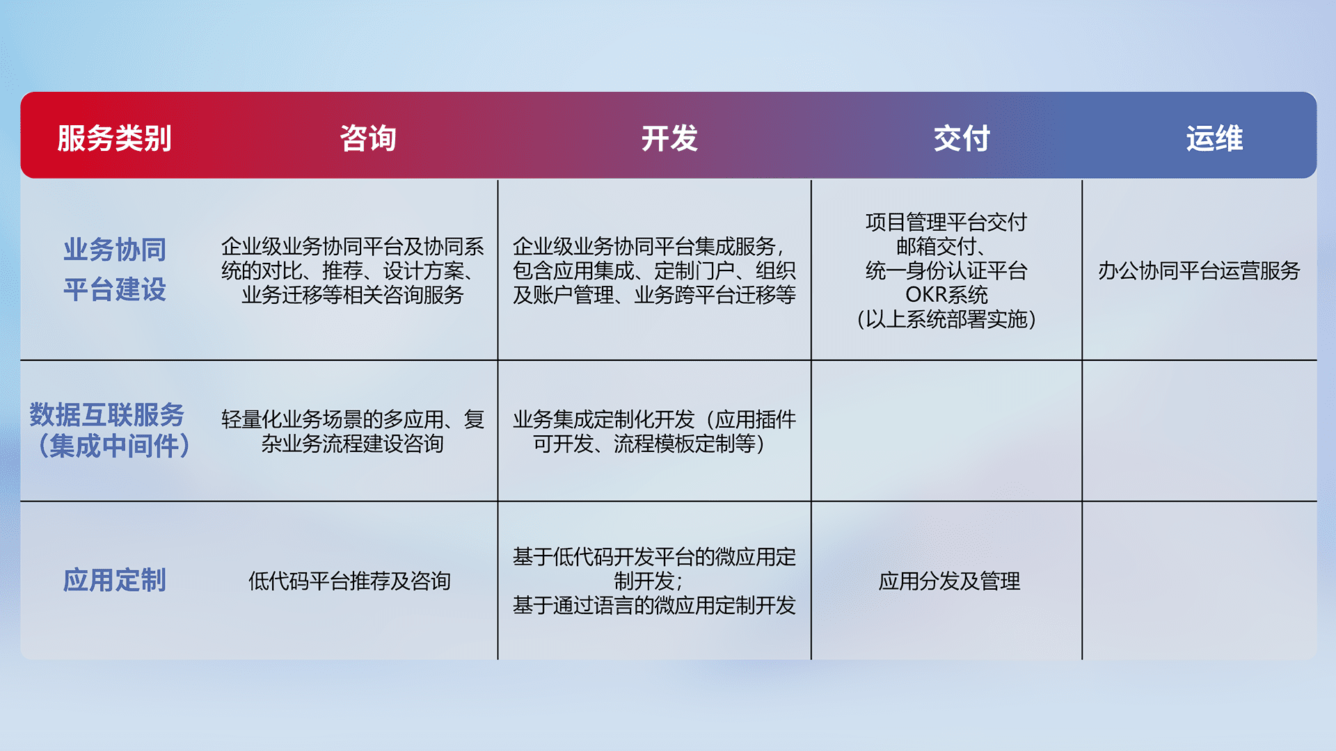 针对钉钉、、企微、、、IDaas等平台级产品提供产品的规划、、、方案、、交付、、定制化开发等服务,,,,实现如统一协同办公、、、、智能客户服务、、、、混合会议管理、、、智能数据查询、、、、等业务场景,,,实现数字化转型。。。。