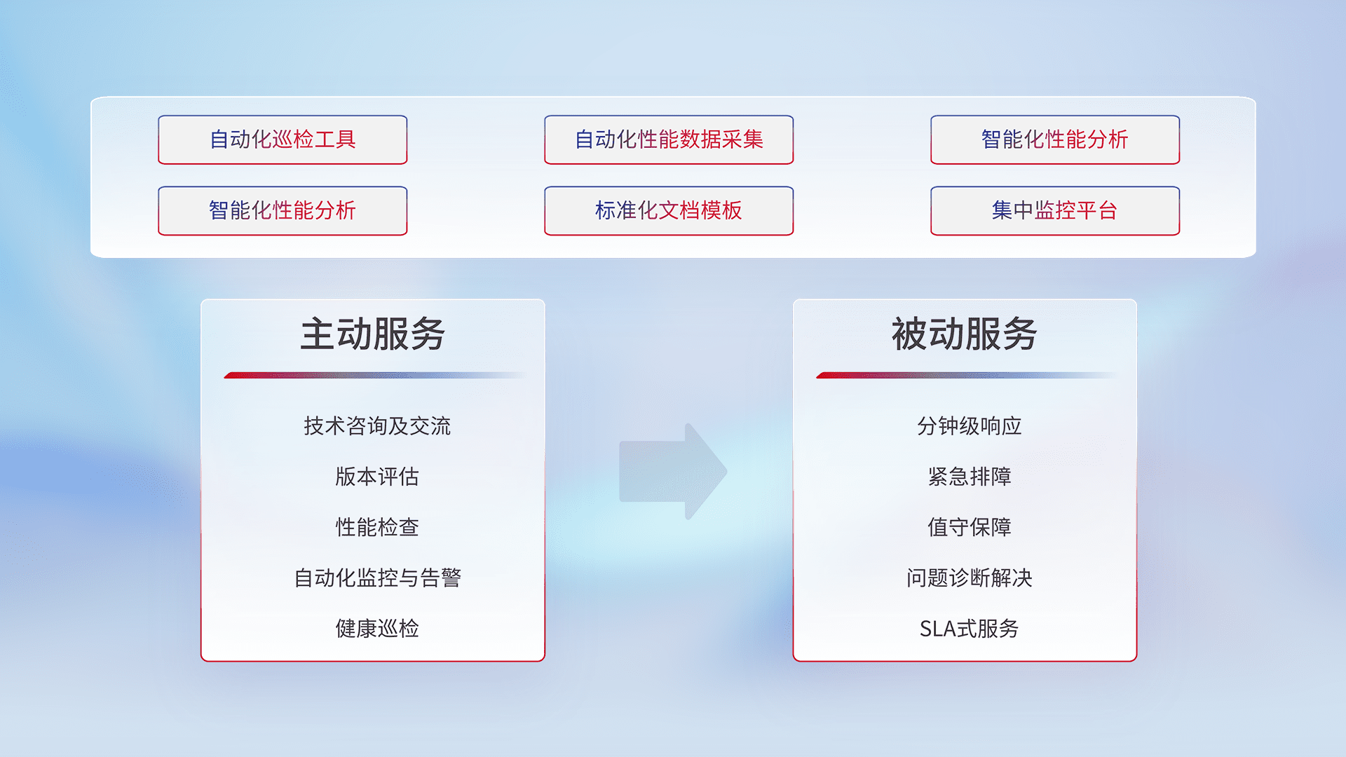 智能化工具和标准化文档,,保障服务质量,,提供主动服务(包含技术咨询、、、版本评估、、、、性能检查、、自动化监控与告警、、、、健康巡检)和被动服务包含(分钟级响应、、紧急排障、、值守保障、、、、问题诊断解决、、、、SLA服务)。。。。