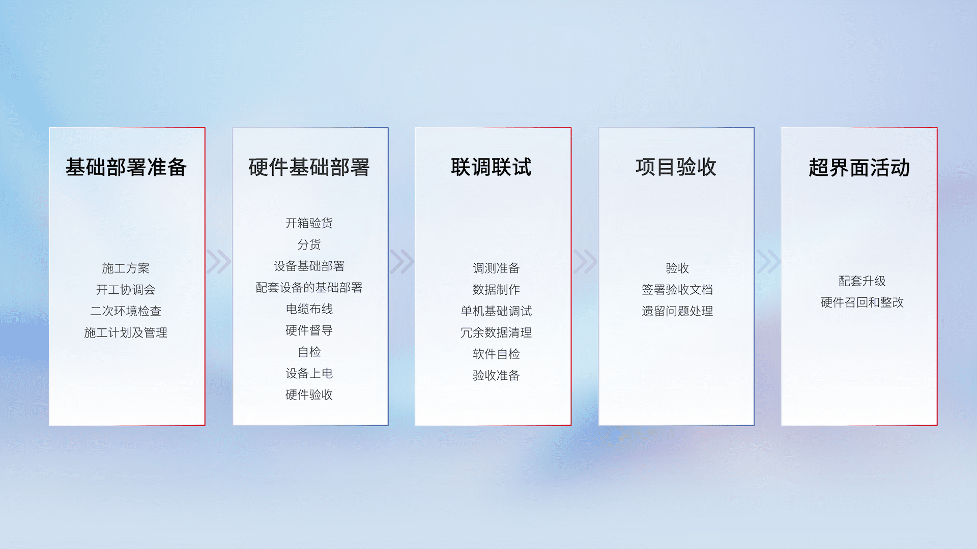 从基础部署准备、、硬件基础部署、、联调联试、、、、项目验收、、、、越界面活动的全过程可追溯,,保证施工质量和进度。。。。